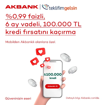 %0,99 faiz oranı ve 6 ay vade ile 100.000 TL’ye varan kredi kampanyasından, 11 Ekim 2025 – 19 Ekim 2025 tarihleri arasında Akbank Mobil’i indirip “Akbanklı olmak istiyorum” adımından ilerleyerek uzaktan Akbanklı olma* sürecini ilk kez tamamlayan yeni Akbanklılar faydalanabilirler.
