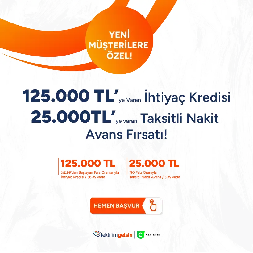 %2,99'dan başlayan oranlarla Hoş Geldin Kredisi ve %0 faizli Taksitli Nakit Avans fırsatlarından yararlanmak için sen de hemen CEPTETEB'li ol!