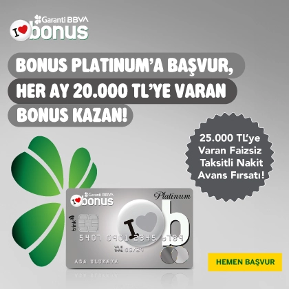 Ücretsiz taksitli nakit avans, her ay toplam 1.500 TL'ye varan bonus kazanabilirsiniz. Garanti Bonus, kredi kartı taksitlendirme ve kredi kartı nakit avans seçenekleri sayesinde nakde sıkıştığınız her an sizlere destek olur. Yıl boyu düzenlenen kredi kartı kampanyaları, anlaşmalı mağazalardan Bonus fırsatlarıyla alışveriş yaparken ekstra Bonus kazanabilmenize olanak tanır.